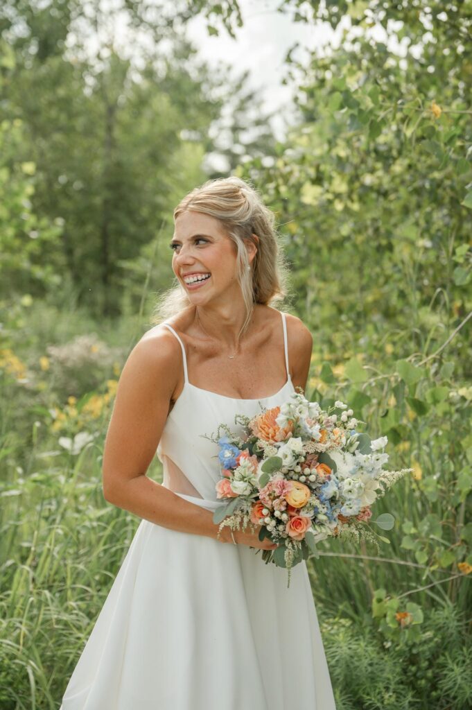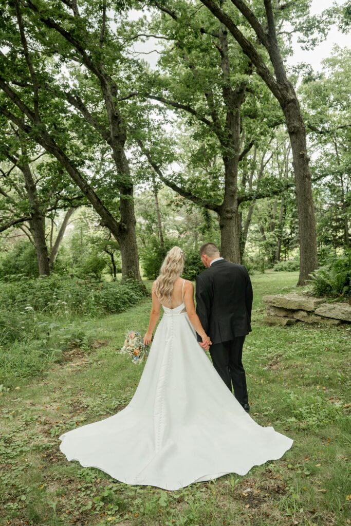 The Eloise is about 25–30 minutes from downtown Madison and blends modern design with timeless elegance. It has gorgeous vaulted ceilings and floor-to-ceiling windows, bringing in plenty of natural light. The venue has a beautiful bridal suite and equally sophisticated groomsmen suite, each with some nice updates in 2025. It’s located in Mount Horeb, about 20-30 minutes outside of Madison, and has indoor and outdoor spaces for wedding ceremonies. The wooded area and open fields around The Eloise make for great portrait opportunities, and magical sunset/golden hour photos!